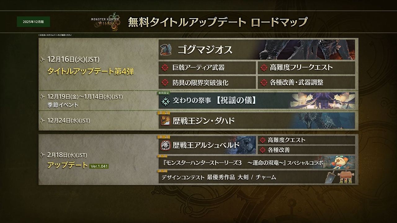 먼저, 12월 16일의 타이틀 업데이트 제 4탄이 예정되어 '몬스터 헌터 와일즈'의 새로운 추가 몬스터를 포함한 대형 업데이트는 이번으로 마지막이 된다. 이후에는 Steam판의 안정도 향상을 목적으로 패치를 진행할 예정이며, 이외에도 2026년 2월 18일에는 새로운 콘텐츠를 포함한 최종 업데이트가 진행될 예정이다.