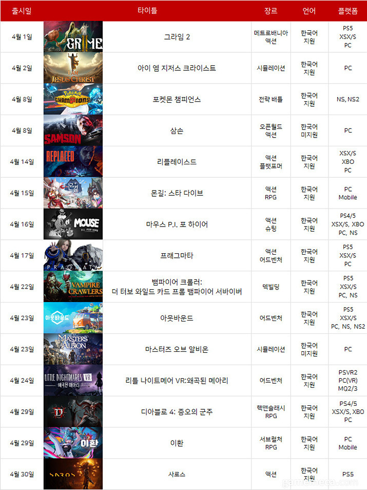 いつの間にか桜が咲いて行く春、3月の果てになりました。温かくなった天気だけ、ゲーム市場も盛り上がっています。前月には’紅の砂漠’や’ポコピア’、’スレイ・ザ・スパイラル2’などの有名作品がリリースされ、寝そびられてしまうこともあるでしょう。4月にもユーザーの財布と睡眠時間を脅威する凄まじい新作が待っています。